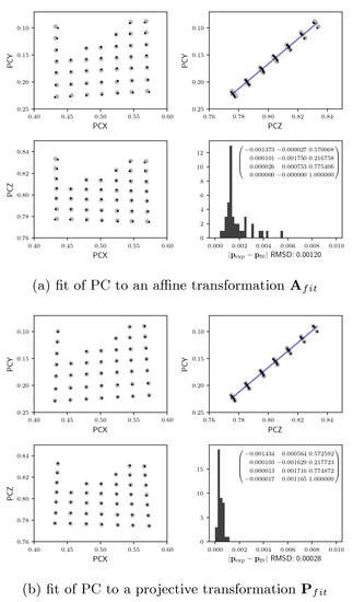 Fit of transformation matrices to the individual experimental projection center (PC) coordinates. The small black points are the experimental data points, and the larger gray filled circles are the respective fit results according to () the affine transformation matrix and () the projective transformation matrix shown in the lower right panels. Experimental data points were measured on a subgrid and selected according to a minimum allowed cross-correlation coefficient . This resulted in the 41 calibration points as shown in the figure.