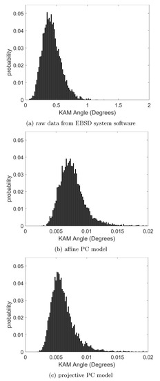 Histograms of the Kernel Average Misorientation angle for the orientation maps resulting from different analysis approaches. () raw data from EBSD system, () refined orientations using affine PC calibration, () refined orientations using projective PC calibration. Note that the x-axis limit in the top panel () is larger by a factor of 100 compared to the other two panels.