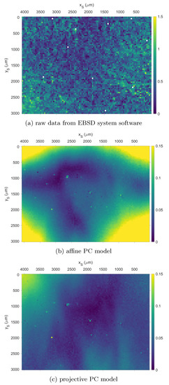 A useful measure to illustrate the variation of orientations in the map is the misorientation angle relative to the mean orientation [34,35,49,56,57]. In Figure 5, we show the maps of the misorientation angle relative to the mean orientation, which result from using the different calibration approaches for the projection center. As we can see by a comparison of the angular scale in Figure 5a to the scales in (b) and (c), the pattern matching orientation refinement in (b,c) reduces the overall, apparent, orientation variation in the map by about an order of magnitude. The comparison of the affine model applied in (b) to the results from the projective model in (c) shows that the projective model leads to a significantly reduced spatial orientation deviation, with the largest difference remaining in the upper left corner of the map. This improvement shows the signifance of the projective calibration in terms of the total orientation consistency in the map. In comparison, the local KAM values are not influenced as critically by the choice of an affine or projective model, as we have seen in Figure 4.