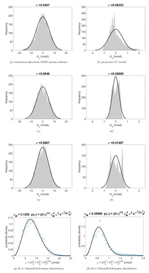 As can be seen in Equation (7), the Maxwell–Boltzmann distribution depends only on one parameter, namely , which, in our application, can be seen to approximately describe an effective standard deviation of the components of the misorientation vectors relative to a true mean orientation. Because of this straightforward statististical meaning, the value of could be used as a key parameter to describe the orientation precision of a specific EBSD setups. We can expect that will depend on the specific combination of SEM, the EBSD system hardware, and the data analysis software, when carried out on easily available Si samples measured in given reference orientations [36].