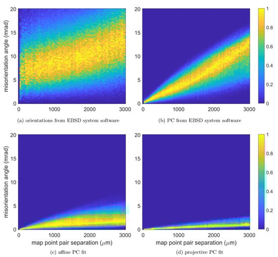 In general, the spread of orientations described by will also depend on the spatial distance of the map points which have been used to calculate the distribution of the misorientation angles . It can be speculated that pairs of map points which are separated by large distances will also tend to show larger misorientations. We have quantified this expectation by calculating the pairwise misorientation angles for a given number of randomly selected pairs from the map, and counting the number of pairs within specific intervals of distances and misorientation angles as two-dimensional histograms. The resulting two-dimensional histograms for pairs from the Si map are shown in Figure 7. In these figures, the distributions of the misorientation angle in each given bin of map point pair separation are normalized to the maximum of the counts for all angles in that bin. In this way, the distance-dependend shift of the maximum and the changes in the width of the distribution is emphasized. The spatial step size in the histogram is 40 m. For the raw EBSD data, it can be seen that the dominating misorientation values are between 5 and 10 mrad for map point separations in the order of 100 m, and this interval rises towards values between 10 and 15 mrad for a separation near 3 mm. As can be seen in panel (b), the orientation precision of nearby points can be improved by pattern matching using an unrefined projection center as given by the EBSD system software, but the misorientation at a large distance still tends to similar values as in the raw data. For the affine PC model shown in (c), the misorientation angles stay below 5 mrad, and in (d) we can see that the projective model has a still sharper distribution with angles predominantly below 1 mrad deviation. Thus, the projective model for the projection center also leads to the least increase in relative misorientation between spatially separated data points which nominally have the same orientation. We note that this type of information about the spatially changing, systematic orientation errors is usually not accessible in measurements from polycrystalline maps because the separated points then are very likely to be in different grains. In that situation, the locally changing systematic orientation error is masked by the locally changing grain orientations.