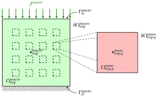The test specimen has a cubic shape and is submitted to a simple external load. On the upper side of the specimen, a surface force field is applied, while the opposite side of the specimen is clamped. Then, during the same and unique experimental loading, the displacement fields at both macroscale and mesoscale are simultaneously measured, for instance in using two optical digital cameras equipped with CCD imaging sensors with different spatial resolutions for the simultaneous acquisition of displacement field optical measurements at both macroscopic and mesoscopic scales. The measurements are performed on the domain at macroscale and on the domain at mesoscale that are 2D or 3D parts of the specimen at macroscale and mesoscale, respectively. These domains can be 3D in the case of microtomography techniques for the acquisition of 3D experimental data, or they can be 2D in the case of digital camera techniques for the acquisition of 2D experimental data. Note that in case the dimensions of the mesoscopic domain of observation are very small with respect to the dimensions of the macroscopic domain of observation , then more information can be used by collecting additional experimental field measurements at mesoscale on Q non-overlapping mesoscopic domains of observation for which the relative mutual locations into the test specimen are not necessarily recorded. The experimental database is then constituted of the vector-valued experimental displacement fields and , respectively, at macroscale on and at mesoscale on . The experimental tensor-valued strain fields and , respectively associated to the experimental displacement fields and , can be calculated by post-processing through interpolation techniques.