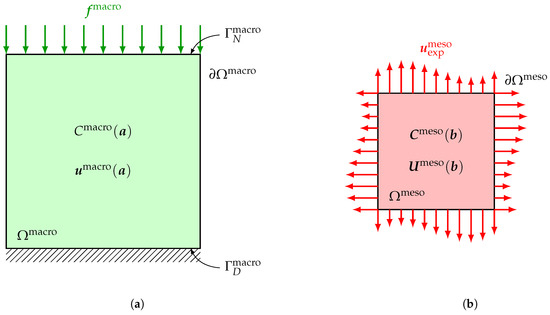 Boundary value problems at (a) macroscale and (b) mesoscale. (a) Deterministic boundary value problem characterized by deterministic elasticity tensor at macroscale: deterministic displacement field computed at macroscale in ; (b) Stochastic boundary value problem characterized by random elasticity tensor field at mesoscale: random displacement field computed at mesoscale in .