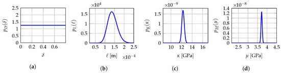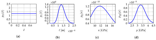 in which is the indicator function of the interval such that if and if , where are positive parameters to be identified. We refer the reader to Reference [168] for a detailed construction of the prior stochastic model of and a rigorous characterization of the statistical dependence between the components of random elasticity tensors exhibiting a.s. some given material symmetry properties for the six highest levels of linear elastic symmetries. For the special case of isotropic materials, we have and the prior probability density function of random vector is written as for all ,