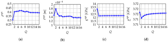 At mesoscale, the solution of stochastic boundary value problem (7)–(10) with 2D plane stress assumption depends only on 6 components of random compliance tensor field with or equivalently on every 21 components of random elasticity tensor field with . It is the reason why we have chosen to construct the prior stochastic model of the random compliance tensor field as presented in Section 4 and the stochastic boundary value problem (7)–(10) is solved in using (11) rather than (8). Furthermore, its mean function is spatially constant and models an isotropic elastic medium that is completely characterized by a mean bulk modulus and a mean shear modulus at mesoscale. Consequently, the vector-valued hyperparameter involves only (i) a dispersion parameter , (ii) a spatial correlation length ℓ that is such that in order to be consistent with the effective model at macroscale for which the material is assumed to be isotropic and with in order to be consistent with the 2D plane stress assumption, and (iii) a vector-valued hyperparameter gathering the mean bulk modulus and the mean shear modulus at mesoscale. In particular, we have chosen the experimental value with , m, GPa and GPa, corresponding to a mean Young’s modulus GPa and a mean Poisson’s ratio GPa. For identification purposes and further computational savings, we consider a reduced admissible set for the vector-valued hyperparameter such that , m, GPa, GPa, instead of the full admissible set with (with in linear elasticity). This reduced admissible set is then discretized into equidistant points in each dimension for which the three numerical indicators , and defined in Section 6.4 are evaluated and compared. The identified values of hyperparameters for each of the Q mesoscopic domains of observation are then searched on this multidimensional grid of points in the hypercube .