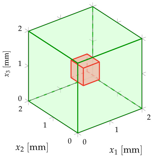 where is the effective elasticity tensor constructed by computational stochastic homogenization of in an open bounded mesoscopic domain , which is assumed to be a representative volume element. It should be noted that, under scale separation assumption, is actually a random tensor for which the level of statistical fluctuations tends to zero when the size of domain tends to infinity [68,128,131]. This is the reason why the statistical mean value has been considered in the definition (18) of instead of the effective elasticity tensor itself. The multiscale indicator defined by (18) allows for quantifying the relative distance between (i) the macroscopic elasticity tensor involved in the deterministic boundary value problem (2)–(6) at macroscale, and (ii) the statistical mean value of the effective elasticity tensor calculated by a computational stochastic homogenization method in the mesoscopic subdomain of the random elasticity field involved in the stochastic boundary value problem (7)–(10) at mesoscale.