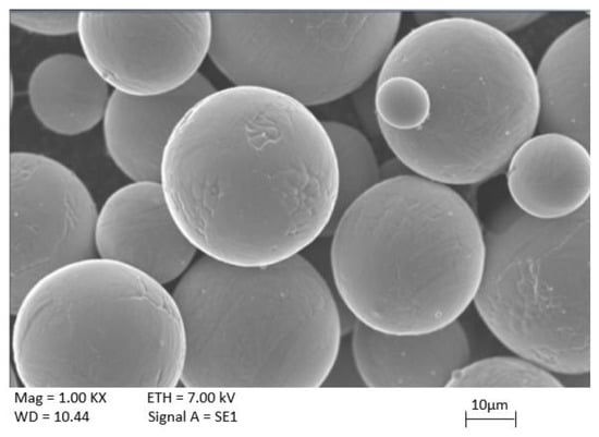 The Grade II pure titanium powder (KAMB Company, Warsow, Poland) with chemical composition declared by the producer (Table 1), was used to prepare test samples. The powder material was spherical in shape, with size fraction in the range from 15 to 45 µm (Figure 1).