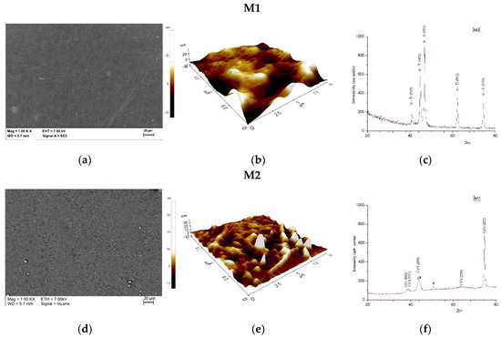 The samples in the initial state M1 were fabricated by the SLM method successfully. The surface of the tested samples subjected to the surface modification were homogenous and no unmelted powder particles and porosity or other defects could be seen. The mean value of the Ra parameter for the M1 samples group, obtained by the AFM method for 25 × 25 µm was an approximately 84 ± 14 nm (Table 6). The X-ray diffraction (XRD) patterns (Figure 3c) of samples in initial state M1 resulted in only alpha, which confirms the data contained in the material card, which was provided by the manufacturer. The scanning electron microscopy (SEM) and AFM (Figure 3) results of samples after PVD surface modification are continuous, no delamination in coating continuity was observed. Nitride layers were uniform, with no spalling and discoloration, surface was relatively smooth because the subtle scratches on the polished surface (Figure 3a) were covered by the CrN or TiN films (Figure 3d,g) [53]. However, there are a lot of microparticles on the surface of TiN coating, which is a common phenomenon in the arc evaporation PVD process. Additionally, it is noted that CrN coating, deposited by sputtering method exhibit more uniform surface morphology, without the formation of particles in the coatings. The particles on the surface of the M2 and M3 sample visible in Figure 3 can be Cr and Ti agglomerates less frequently observed for CrN. Based on the obtained results changes in morphology of the coatings deposited can be observed, resulting in elevated surface roughness. The highest values of surface roughness parameters were obtained for the samples with CrN layer M2 and the mean value was 187 ± 24 nm. The deposited TiN layer (M3 samples group) proved to decrease the surface topography compared to the samples in the initial state Grade_is. The lowest value of surface roughness was obtained for the Grade_TiN sample group and the mean value of Ra parameter was 42 ± 9 nm (Table 6). Based on the local chemical analysis it can be concluded, that the process of the modification was properly carried out, according to the assumptions. The XRD spectrum shows that CrN coating and the TiN coatings (Figure 3f,i) have strong (113) and (111) preferential orientation, respectively.