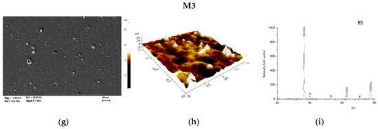 Images of surface topography phase composition measurements, for M1 samples group (a) SEM image; (b) atomic force microscopy (AFM) results (c) X-ray diffraction (XRD) pattern; for M2 samples group (d) SEM image; (e) AFM results (f) XRD pattern and for M3 samples group (g) SEM image; (h) AFM results (i) XRD pattern.