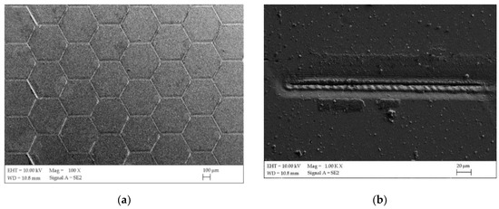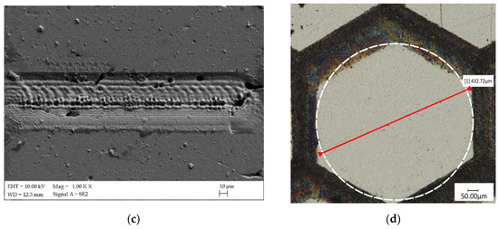 The same textures were generated with the same laser processing parameters on both samples’ groups after surface modification (Figure 4). The diameter of the dimples was very even and fitted the design well. It can be seen from Figure 4d that the dimensions of the generated honeycomb were consistent with the CAD’s model dimensions. The dimension of the circle inscribed for both sample groups after texturing a single hexagon was approximately D = 0.475 mm, which was comparable to the dimensions of the CAD model, where the diameter was D = 0.5 mm. Based on the microscopic investigation it can be found that grooves present typical laser induced surface structures, which were formed by the interaction of laser beam and sample surface. The textured surfaces obtained by laser ablation have been characterized as continuous groove, characterized by a non-regular explosively evaporated bottom (Figure 4b). Corrugated grooves with holes and chaotic structures especially for M4 samples group have also been observed (Figure 4c). For the M4 and M5 sample groups, this formed noticeable areas with slightly different colors, which is the effect of various oxide films that were formed on the surface of the treated areas. The texturing process was carried out without a protective atmosphere.
