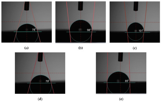 Sample measurement of wetting angle (a) M1; (b) M2; (c) M3; (d) M4; (e) M5.