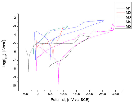 The purpose of potentiodynamic testing was to evaluate the pitting resistance in form of anodic polarization curves shown in Figure 8. Additionally, the characteristic values describing the pitting corrosion resistance are presented in Table 8. Only for the samples in initial state M1 were the hysteresis loops recorded; the existence breakthrough potential Eb and the repassivation potential Ecp, proving initiation and development of pitting corrosion, were measured (Figure 8). The mean values of breakdown potential and repassivation potential were Eb = 1379 ± 87 mV and Ecp = 1379 ± 87 mV, respectively. For other sample groups the progress of anodic polarization curves was characteristic for the samples with high pitting corrosion resistance. The existence of the transpassivation potential has been stated. The highest value of transpassivation potential was observed for the 5th sample group M5 (the samples with TiN layer and after texturing treatment) and the mean value was approximately Etr = 3052 ± 143 mV. Similar results were observed for the samples with that same layer M3 and the average value of transpassivation potential was Etr = 2572 ± 102 mV. However, in samples with CrN film deposited by the PVD method, lower values of transpassivation potential were noted, regardless of the presence of the texture on the surface. The values for M2 and M4 were similar and were in the range from 1088 to 1104 mV. Additionally, the values of transpassivation potential for both sample groups with CrN layer were lower comparable to the value of breakdown potential established for the samples in initial state M1, which indicates lower resistance to pitting corrosion.