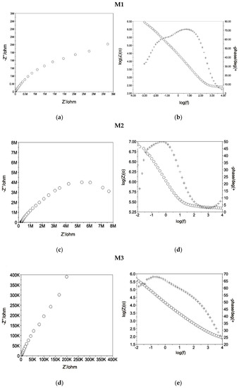 During the next stage, EIS tests were carried out to evaluate the electrochemical properties and obtain additional information about corrosion resistance. The results in the form of impedance spectra for all tested samples are presented in Figure 9. The determined impedance spectra point to diversified kinetics of the corrosion processes taking place in the system-tested samples, using Ringer solution. The Nyquist diagrams for all tested samples presented fragments of semi-circles, which is typical for the thin layer (Figure 9a,c,e,g). The presented semi-circles were deformed to a different degree, in some cases from the linear relation between the components of the imaginary impedance Z” and the real one Z’. For the samples with TiN layer and after texturing the fragments of semi-circles were placed near the beginning of the coordinate system and the biggest were observed, which pointed to better corrosion resistance compared to the other sample groups. The maximum value of phase displacement at a broad range of frequencies presented in Bode diagram (Figure 9b,d,f,h) for the samples in initial state M1 was approximately Θ = 70°. Additionally, the values of the maximum value phase displacement for the samples obtained with the same layer (before and after texturing) were similar and were Θ = 50° for the samples with CrN (Figure 9d,g) coat and were in the range Θ = 65–70° for the samples with TiN coat (Figure 9e,h). For all sample variants, the inclinations log|Z| at the whole scope of frequency change are close to −1 which indicates the capacity character of the porous layer.