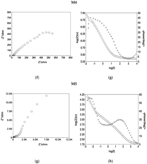 The fifth sample group M5 was characterized by high electrochemical stability, which was proved by relatively high value charge transfer resistance Rct. The mean value of Rct parameters for M5 was 11,320 kΩcm2, which was similar to the value obtained for the M3 sample group, 10,254 kΩcm2.