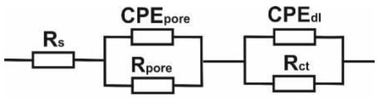 The analysis of the impedance spectra of corrosive systems tested samples using Ringer’s solution, the equivalent electrical system shown in Figure 10 was used. Based on this, the parameters of the electrical components of the replacement circuits describing the corrosion systems were determined—See Table 9. This method allowed the analysis and interpretation of processes and phenomena occurring at the interface: Tested samples - Ringer’s solution. Impedance spectra (Figure 10) obtained for the analyzed samples were interpreted by comparison to a substitute electrical system, which indicates the occurrence of two sublayers: A compact internal and a porous external layer (two time constants visible on the graph), where Rs is the resistance of electrolyte (Ringer solution), Rpore—electrolyte resistance in the porous phase, CPEpore—capacity of the double layer (porous, surface), Rct—resistance of the deposited coating (characterizes the electric charge transfer resistance at the boundary of phases: Grade II—surface layer—Ringer solution) and CPEdl—capacity of the deposited coating, Figure 10. The use of two constant-phase elements in an electrical substitute circuit positively influenced the quality of fitting the experimentally determined curves. The mathematical impedance model of the above system is also presented in the Equation (3).