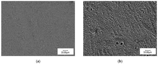 The wear test was performed using the pin-on-disc method. The test was carried out using a CSM tribometer (CSM Instruments, Needham, MA USA), equipped with an arm with a pin holder, controller and the rotated stage. A ceramic ball Al2O3 with the 6 mm and 1300 HV hardness dimeter was used as a counter specimen. The test was carried out with the load of 10 N and the linear speed was 10 cm/s. Prior to wear tests, both the tested samples and ball were ultrasonically cleaned in acetone. Based on the performed measurements, the value of the coefficient of friction µ was determined. All the tests were performed in ambient air conditions with temperature in the range of 18–22 °C and humidity an approximately 52–60%. For each samples group, to guarantee the stability and accuracy of the experimental data, each test was repeated five times. The wear volume was calculated based on the cross-sectional area of the wear tracks, that were measured using a profilometer (Surtronic, Taylor Hobson, UK). The wear factor W was calculated according to Equation (2) [52], were V is wear volume [m3], Fn—force [N], S—total sliding distance [m].