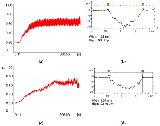Examples of results of wear test for the M4 samples group: (a) diagram of coefficient friction changes; (b) wipe profile, and results of wear test for M5 samples (c) diagram of coefficient friction changes; (d) wipe profile.