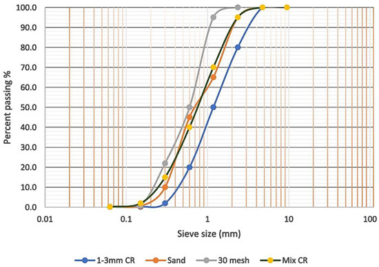 Grading curve of fine sand and crumb rubber.