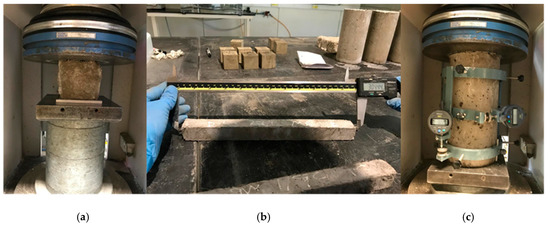 Hardened samples and testing set-up. (a) Compressive strength test, (b) Drying shrinkage test, and (c) Elastic modulus and Poisson’s ratio test.