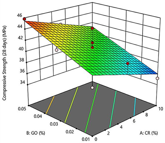 Figure 3 illustrates the three-dimensional (3D) surface response analysis of the developed GO-RECC. These indicate the deformable effects of CR, as a partial replacement of fine aggregates, and GO, as a filler material, on the compressive strength of GO-RECC.