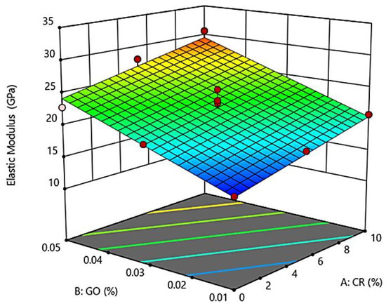 Figure 4 shows the 3D surface response representing the interaction effect of CR replacement and the addition of GO on the modulus of elasticity of the developed GO-RECC. The results show that the range of 0–5% CR replacement and 0.01–0.05% GO gave an elastic modulus range of 15.08 GPa to 30.7 GPa. As shown in the 3D surface response, with the concurrent increment of CR replacement and GO percentage, the elastic modulus of GO-RECC increased. It can also be observed that the addition of GO had more of an effect on the elastic modulus of GO-RECC compared to CR.