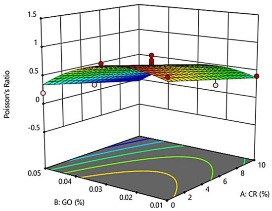 On the other hand, the functions for Poisson’s ratio and drying shrinkage were quadratic functions, as shown in Table 7. The models for Poisson’s ratio and drying shrinkage, as well as its terms A (CR) and B (GO), were significant with p-values less than 0.05. However, the terms B, AB, and A2 for the drying shrinkage model were insignificant with a p-value greater than 0.05. Therefore, the terms B, AB, and A2 did not have a significant effect on the drying shrinkage of the developed GO-RECC. The quadratic functions of Poisson’s ratio and drying shrinkage are shown in Equations (3) and (4), respectively.