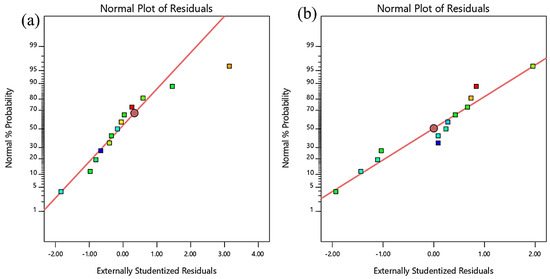 The RSM models can also be validated through normality plots, as shown in Figure 7 and Figure 8. This is a graphical method used to evaluate the accuracy of the data. It is obvious that all the plots had points that fell close to the straight line, thus proving that the dataset was normally distributed, and the degree of randomness was the same for all fitted/predicted values. This proves the model’s fairness, as the residuals (the difference between experimental data and fitted values predicted by the model) were randomly distributed around zero. The entire normality plot shows that some responses differed from the predicted values. However, as long as these were within the red control limits, they are still acceptable.