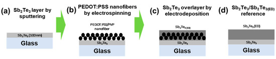 Recently, there has been significant interest in the electrospinning technique as a large-scale synthesis method for 1D organic polymer fibers with nano-sized diameters [30,31]. As electrospinning can be adapted to produce PEDOT:PSS nanofibers, herein, we suggest a new type of inorganic–organic hybrid composite material that includes 1D nanofibers of PEDOT:PSS embedded in Sb2Te3 for high power factors. To fabricate the hybrid nanofiber composite composed of Sb2Te3 and the conducting PEDOT:PSS polymers, their durability must be improved prior to use as free-standing structures over large areas. Thus, a novel method for fabricating hybrid composites is necessary to achieve good mechanical strength and thermoelectric properties. In this study, inorganic-organic-inorganic composite films were fabricated by a stepwise coating process, with sequential deposition of Sb2Te3, PEDOT:PSS, and Sb2Te3 by sputtering, electrospinning, and electrodeposition, respectively.