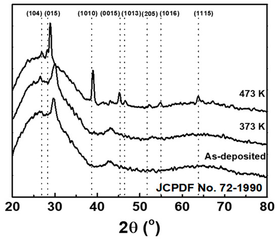 X-ray diffraction patterns of as-deposited Sb2Te3 (100 nm thickness) film and after annealing at 373 or 473 K.