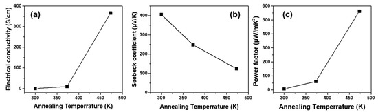 (a) Electrical conductivity, (σ), (b) Seebeck coefficient, (S), and (c) power factor as functions of annealing temperature (373, 473 K) for 100 nm thick Sb2Te3 films deposited on polished glass substrates at room temperature (300 K).
