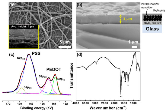 SEM of the (a) top view of the Sb2Te3/PEDOT:PSS-PVP composite film and (b) cross-sectional view after fully compositing the Sb2Te3/PEDOT:PSS-PVP/Sb2Te3(ED) film. (c) XPS spectrum (black line) and deconvoluted S 2p peaks for the PEDOT:PSS-PVP fibers. (d) FT-IR spectrum of the Sb2Te3/PEDOT:PSS-PVP/Sb2Te3(ED) composite film.