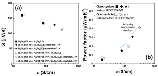 Comparison of the (a) Seebeck coefficients S and (b) power factors for reference Sb2Te3/Sb2Te3(ED) and Sb2Te3/PEDOT:PSS-PVP/Sb2Te3(ED) composite films as functions of the electrical conductivity σ and annealing temperature.