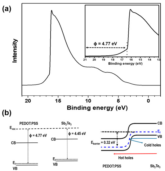 where the hν is the energy of He(I) irradiation (21.22 eV) and Ecut-off is the secondary cut-off level. Thus, as depicted in Figure 6b, an energy barrier with a height of ~0.32 eV can be formed near the interface between PEDOT:PSS and Sb2Te3, while the work function of Sb2Te3 is 4.45 eV [41]. Most of the carriers can pass over the energy barrier, although low energy carriers are blocked. Therefore, the S can be increased because of the reduced coupling of electrons and holes in the valence band. The embedded PEDOT:PSS nanofibers formed in the Sb2Te3 matrix effectively transport charge carriers, and the potential energy barrier formed between the PEDOT:PSS and Sb2Te3 hybrid composite seems to block the low energy carriers around the Fermi energy level, according to the charge filtering effect.