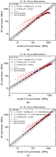 Predictive capability of the displacement-based scheme Equation (3) as applied to deflection data: predicted yield stress vs. numerically implemented proof stress (as determined by Equation (2) for 0.2% of strain) for GPa (a), 210 GPa (b) and 400 GPa (c), respectively. If compared with the traditional formula (Equation (1)), cf. red cross symbols, the degree of agreement is much superior with the K dependent formula.