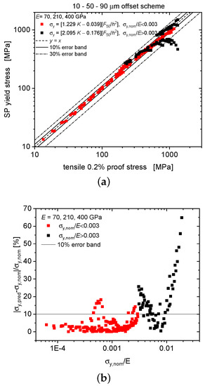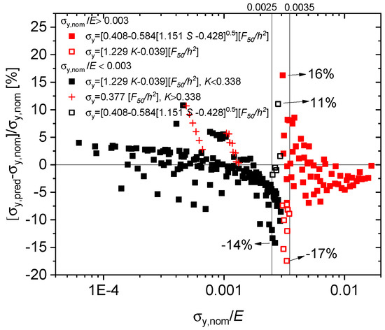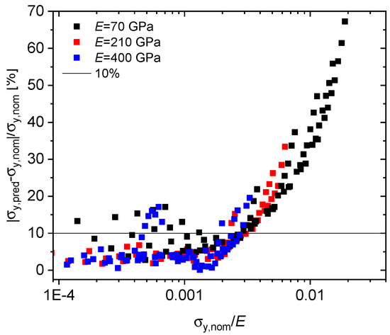 Yield stresses predicted by the displacement-based formula of Equation (3), however, as applied to deflection data, thereby neglecting the difference between displacement and deflection, are compared with the actually implemented tensile proof stresses in Figure 3. Similar to the results based on force–displacement curves presented in Reference [17], the force–deflection curve results (square symbols) exhibit a much improved correlation quality as compared to Equation (1) (red crosses, for which for the sake of comparability was also set to 0.36). Agreement further improves with increasing elastic modulus. Nevertheless, as seen in Figure 4, error percentages for relative strengths in excess of may exceed 10% and still rise up to 67% for , pointing at the need for refining the yield prediction scheme specifically for deflection-based data.