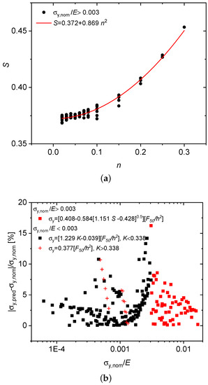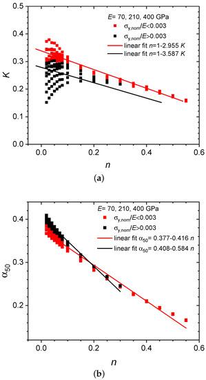 To develop a formula featuring improved predictive capability for the whole strength and hardening domain, the entire data set, that is, all three Young’s moduli were analyzed together. Linear relations for K and the yield coefficient as functions of the hardening exponent n were obtained (Figure 5) and used to identify again stepwise linear functions for estimating in terms of Equations (5)–(7). Contrary to what was found for the displacement-based data [17], it turned out impossible to find a common formulation for all the deflection-based data. We rather have to distinguish a low-strength and a high-strength regime with and , respectively.