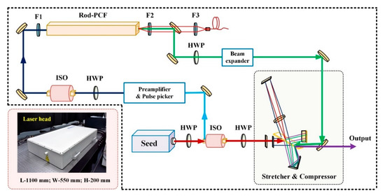 The schematic of the high-power CPA setup is shown in Figure 1. It consists of a femtosecond oscillator, two isolators, a double-pass preamplifier with an electro-optical pulse picker, an ytterbium-doped rod-PCF, and a dielectric-grating-based stretcher and compressor.