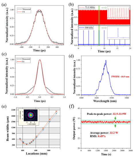 The diode-pumped Ytterbium femtosecond oscillator (MONTFORT Laser GmbH) runs at a 73.5 MHz repetition rate, delivering pulses 130 fs at 1045 nm center wavelength (13 nm bandwidth) and 1 W output power, corresponding to 13.6 nJ single pulse energy. After going through an isolator, the seed is injected into the stretcher and compressor (a 130 mm × 20 mm conventional gold-coated 1600 line/mm diffraction grating, LightSmyth Technologies, Inc. Eugene, OR, USA), which stretches the width of the laser pulses from 130 fs to ~200 ps (see Figure 2a). For higher pulse energy while increasing the average power, the repetition rate of the seed is reduced from 73.5 MHz to 500 kHz by the electro-optic switch driven pulse picker (EKSMA Optics). Figure 2b shows the oscilloscope trace of the seed and picked pulses. Then, the picked pulses are amplified to an average power of ~2 W via the double-pass fiber preamplifier. The main amplifier is constructed using an 80 cm long air-cladding rod-PCF (NKT photonics) with an 85 µm core and 65 µm mode-field, which is pumped by a fiber-coupled 976 nm laser diode. The stretched pulses are amplified to 42 W at the pump power of 132 W. With the same diffraction grating, the amplified pulses are dechirped to 272 fs pulse duration with a maximum output power of 33.2 W. Here, the stretching and compression limits of the pulses are mainly limited by the available size of the diffraction grating, and the power can be further increased by increasing the output power of the preamplifier. Figure 2c,d show the measured autocorrelation trace and spectral width at the highest output power, respectively. The side wings observed for the dechirped pulse (see Figure 2c) are caused by the three-order dispersion (TOD), which can be restrained by optimizing the stretcher and compressor. However, since the side wings on the spectrum have no effect on industrial processing applications, further optimization of the stretcher and compressor is not conducted. The laser output is horizontally polarized with a diameter at the exit of 3.5 mm and a divergence less than 0.04 mrad. The beam quality at the maximum output power is measured, showing Gaussian distribution of near-field with M2 = 1.1 ± 0.05 (mean value between the two orthogonal axes), as shown in Figure 2e. The small asymmetric around the focus (far-field) can be corrected by the optimization of the CPA system. To keep the optical elements from the dust and humidity, the laser is sealed by silica gel sealing ring for better environmental stability. Figure 2f illustrates the measured power fluctuation in 60 min (non-laboratory conditions at room temperature) which shows high stability with a root-mean-square (RMS) of less than 0.5%. To ensure long-term stability, the laser underwent a five-minute break after the one-hour operation; however, as far as we know, such a duty cycle can meet the requirements of most industrial applications.
