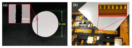 Experiment result of femtosecond laser processing of (a) alumina ceramic with 0.2 mm thickness, and (b) FPC with 0.11 mm thickness.