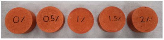 The properties of 0%, 0.5%, 1%, 1.5%, and 2% CB content by mass bricks are shown in Table 2 [38,39]. The compressive strength of a brick is a crucial quality for construction materials. In this study, the results indicate that the strength of the clay brick was significantly dependent on the quantity of CBs added. A decrease in compressive strength was found with the decrease in density and the increase in CB content. The results reveal that the compressive strength was in the range of 27.2–48.64 MPa, with a decrease in CB content from 2% to 0% by mass. Although there is a substantial decrease in strength with the increase in CB content, the values are considerably above the standard minimum compressive strength of 17.2 MPa for Grade MW (moderate weathering) bricks [40]. The density of the fired bricks was in the range of 1969–2114 kg m−3, with a decrease in CB content from 2% to 0% by mass. Light-weight bricks have several benefits in construction and production, including the reduction in transportation and labor costs and improving the thermal insulation properties of bricks.