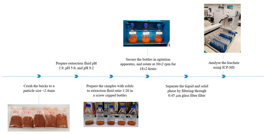 Samples were prepared based on a 1:20 ratio in screw cap bottles. The mass of the crushed fired clay brick samples used in this study was 10 g, while the volume of the extraction fluid was 200 mL. The bottles were then placed in an agitator and rotated at 30 ± 2 rpm for 18 ± 2 h. The fluid extract was attained by filtering the samples through a 0.45-microfilter to separate it from the solid phase. The ICP-MS was utilized to analyze the extracted samples for heavy metals. The results exhibited in this study are the average of three replicates.