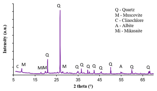 The brick soil used in this study was sandy silty clay (MC) according to the unified soil classifications [36]. The results of the PSD are shown in Figure 4, which was carried out using sieve size analysis [36]. For the brick soil, the plastic limit was found to be 25% and 34% for the liquid limit. The XRF results of the chemical composition of the brick soil are given in Figure 5, while the XRD results of the mineralogical composition of the brick soil can be seen in Figure 6. It was observed that the main crystalline phase on a <75 µm soil sample of the brick soil was Quartz (SiO2).