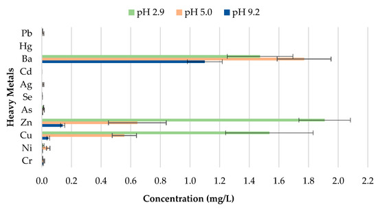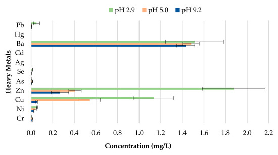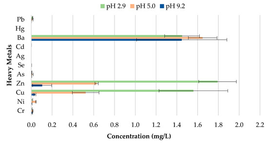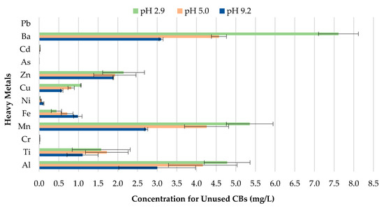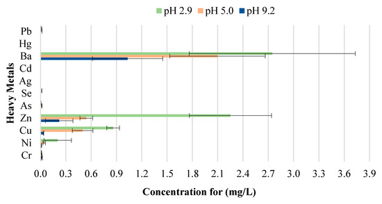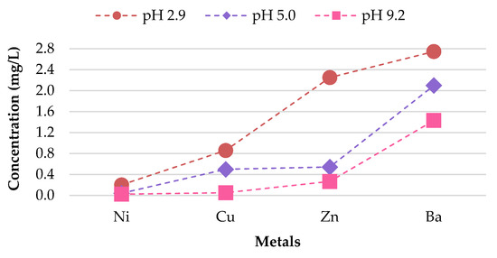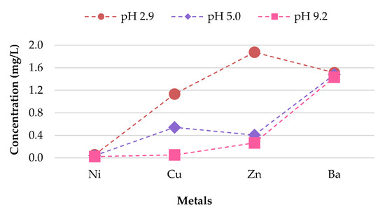 As illustrated in Figure 7, the findings suggest that differences in pH over a wide range of precipitation have an effect on the behavior of the metal concentrations leaching from unused CBs. A direct relationship between the concentrations of Cu, Zn, Mn, Al, and Ba leached, and the corresponding pH value was observed. Cu, Zn, Mn, Al, and Ba demonstrated the highest leachate concentration for pH 2.9, followed by pH 5.0; while pH 9.2 exhibited the lowest metal leachate concentration. The concentration level for Ba was 7.610, 4.572, and 3.1 mg/L for pH 2.9, 5.0, and 9.2. This implies that unused CBs are more likely to leach heavy metals in areas with highly acidic rain compared to the natural range of precipitation. This is due to the enhancement of metal mobilization in acid rain. The hydrogen (H+) ion in the acidic rain disturbs the cations (positively charged ion) from their connection sites, and this results in the decrement of cation exchange capacity and increase in the concentration of cations in CBs, therefore allowing the cations to be leached from the waste [44]. Likewise, the toxic ions (toxic metals) usually bound to the negatively charged surface and are displaced by H+ ion, too [45].