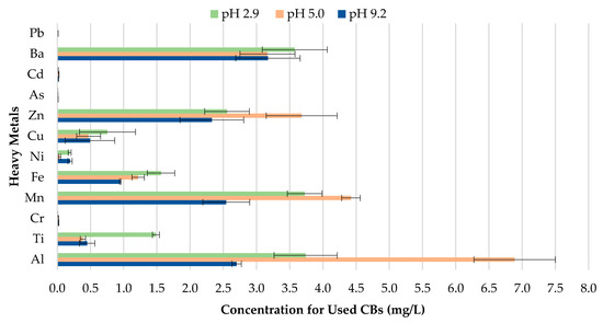The concentration of metals leached for used CBs for pH values 2.9, 5.0, and 9.2 can be seen in Figure 8. The results indicate that changes to the pH of precipitation will likely enhance or reduce the magnitude of metal contamination from used CBs. The metal concentration leachate for Zn, Mn, and Al for pH 5.0 was found to be much more significant compared to pH 2.9 and 9.2. In comparison, Ba, Cu, Ti and Fe depicted greater metal contamination for pH 2.9. Similarly to unused CBs, used CBs are more prone to leaching in highly acidic areas due to the enhancement of metal mobilization in acidic water.