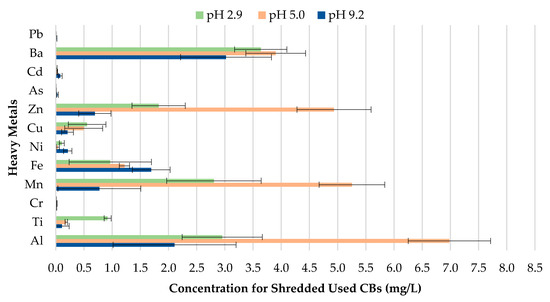 A direct relationship between the metal concentration leached and pH value was found for shredded used CBs. The concentration of the metals leached for pH values, 2.9, 5.0, and 9.2, can be seen in Figure 9. pH 5.0 resulted in the highest magnitude of metal contamination for Ba, Zn, Mn, and Al, followed by pH 2.9, while pH 9.2 demonstrated the least possible metal contamination. The relationship between metal leachate and pH value supports the results attained for both unused and used CBs.