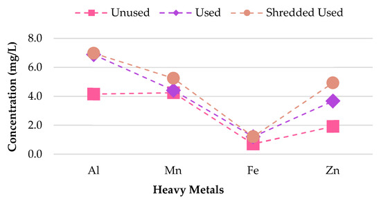 To determine whether the smoking process influences the quantity of heavy metals found within CBs, the metal leachate concentrations for pH 5.0 for unused, used, and shredded used CB samples was analyzed. A linear relationship between the concentration of metals leached and the condition of the sample was found. Cr, Cd, Zn, Mn, Al and Fe contamination was greater for shredded used CBs compared to used and unused CBs (Figure 10). For shredded used CBs, 6.982 mg/L leachate was recorded for Al, compared to 6.887 mg/L leachate for used CBs and 4.161 mg/L for unused CBs. Generally, Al is one of the most abundant elements found in CBs due to its presence in tobacco. Al toxicity can have tissue-damaging effects, alteration in calcium metabolism in several organ systems, and Alzheimer’s disease [46]. The results suggest that used and shredded used CBs are more prone to leaching heavy metals Cr, Cd, Zn, Mn, Al and Fe compared to unused CBs. One explanation for this observation is that an enhanced level of Cr, Cd, Zn, Mn, Al and Fe is absorbed and retained by the filter during combustion. The remnant tobacco, which comprised of burnt and unburnt tobacco, effectively exacerbated the toxicity [47]. Other metals, including Pb and As are of insignificant concern for all sample conditions as their leachate concentrations are below 0.08 mg/L.