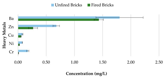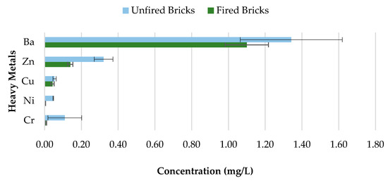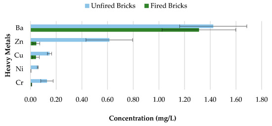 Concerns about heavy metal contamination to the environment that might be initiated through the incorporation of CBs, which cannot be combusted during the firing process, represent a major issue. Therefore, to investigate the variations in concentrations of 0%, 0.5%, 1%, 1.5%, and 2% CB bricks before and after firing, pH value 9.2 was selected. The results are presented in Figure 18, Figure 19, Figure 20 and Figure 21 and Table 4. All data are means of three values relative to standard deviation. The findings show that the leaching behavior of the fired clay bricks is notably lower after the firing process. This is the result of the suppression of metals that are locked in the bricks when fired to high temperatures. This behavior can be associated with the silicate-based physio chemical containment process of fired clay bricks [50]. The main compounds found in the brick soil were silica (SiO2) and iron oxide (Fe2O3). Silica enhances the interconnection and compactness of the material, which can result in metal immobilization [51], while iron oxide can assist in the formation and stability of the material, because of the crystallization-dehydration of less crystallized free iron oxides and the removal of organic materials [52], hence decreasing the leaching potential of heavy metals from the fired clay bricks incorporating CBs.