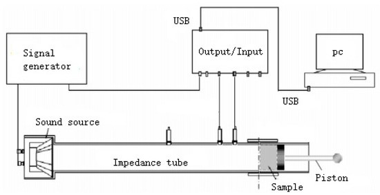 The SW422/SW477 impedance tube sound absorption test system is shown in Figure 1. The impedance tube is a metal cylindrical tube with no other friction on the inner wall, and an inner diameter of 100 mm (for low and medium frequencies) or 30 mm (for high frequencies), respectively. Random sound waves were generated by speakers at the end of the impedance tube, and then the waves were transmitted to the sample surface at the other end. The reflected signal was then received by the sensor. The large tube can measure the sound-absorption coefficient in the frequency range of 80–2500 Hz, while the small tube can generate the sound-absorption coefficient in the frequency range of 1600–6300 Hz. The sound-absorption coefficient in the full frequency range (80–6300 Hz) is a combination of the values measured in the two tubes. During the experimental measurement, the samples were all supported by rigid walls.