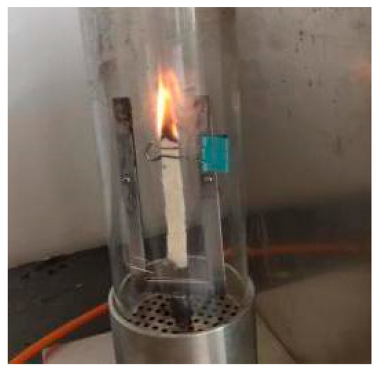 The experiments of the flame-retardant properties were carried out according to the GB/T8924-2005 “Test Method for Combustion Performance of Fiber Reinforced Plastics Oxygen Index Method” standard. The sample size was 12 mm × 10 mm × 4 mm. Limiting oxygen index (LOI) is used to characterize the flame retardant properties of composites where the higher the limit oxygen index, the better the flame-retardant property. When the measured oxygen index was 22~25%, the test sample was flammable. The oxygen index was 26~30%, and the detected sample was flame retardant; when the oxygen index was above 30%, the flame retardant properties were better. The testing of the flame-retardant properties of the composites is shown in Figure 2.