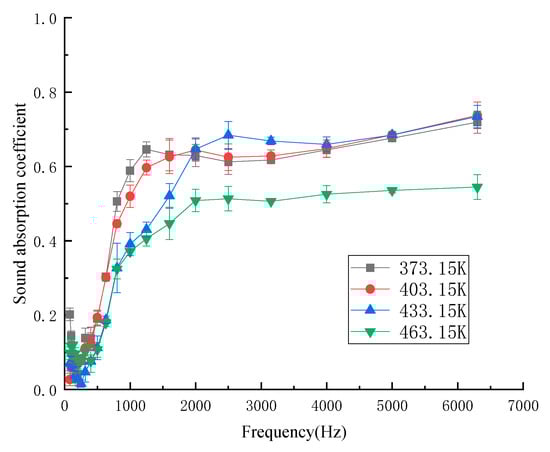 The influence of hot pressing temperature on the sound-absorption coefficient was determined when the hot pressing time was 900 s, the density was 188 kg/m3, the mass fraction of kapok fiber was 50%, and the thickness was 10 mm. Figure 3 shows the influence of different hot pressing temperatures on the sound-absorption coefficient. The sound-absorption frequency range was 80–6300 Hz, covering the low frequency range (200–2000 Hz), intermediate frequency range (2000–4000 Hz), and medium high frequency range (4000–6300 Hz). From Figure 3, the low frequency and sound-absorption properties of composites were not good at the four temperatures. With the increase in temperature in the middle and low frequency region, the sound-absorption coefficient gradually decreased. In the intermediate frequency region, the sound-absorption coefficient started to exceed at 373.15 K, 403.15 K, and 433.15 K. However, the sound absorption coefficient of 463.15 K was still not very good. The sound-absorption coefficient fluctuated slightly in the medium and high frequency regions, but the sound-absorption properties were very good at all three temperatures. The average sound-absorption coefficient of kapok fiber composites at the four hot pressing temperatures was 0.352 (373.15 K), 0.358 (403.15 K), 0.318 (433.15 K), and 0.288 (463.15 K). The average sound-absorption coefficient of the composites at 403.15 K was higher than those with other hot pressing temperatures. At the temperature of 403.15 K, the adhesion between the matrix material and kapok fiber was good, and its pores were more uniform [21]. Therefore, we considered the forming and sound-absorption coefficient of the composites at the hot pressing temperature of 403.15 K.